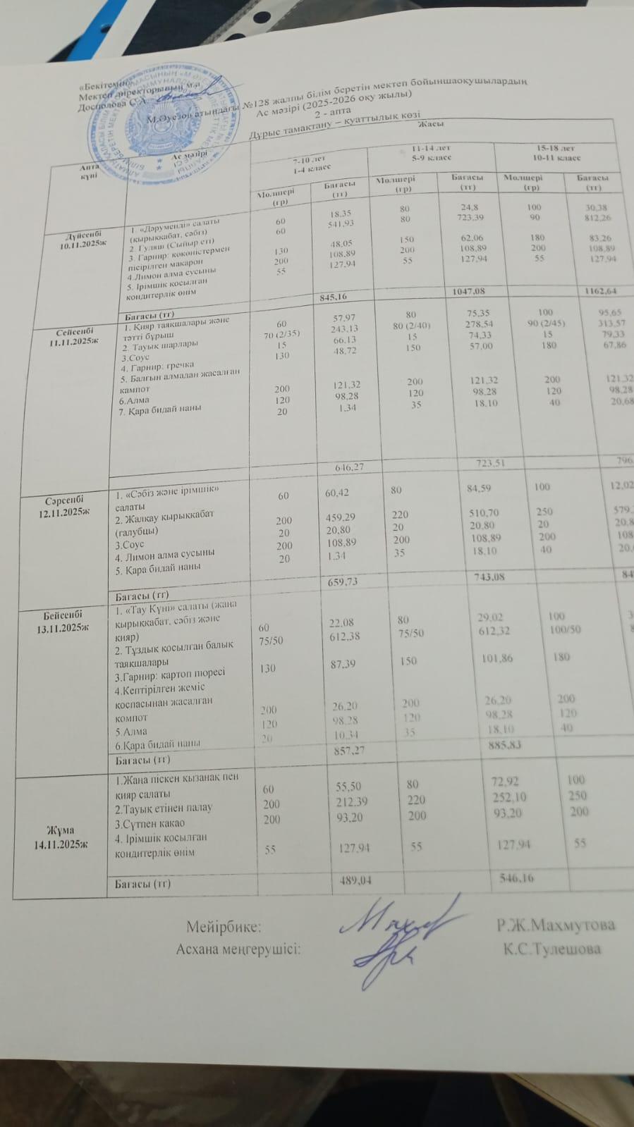10 ноябрь 2025 Ас мәзірі 2 апта