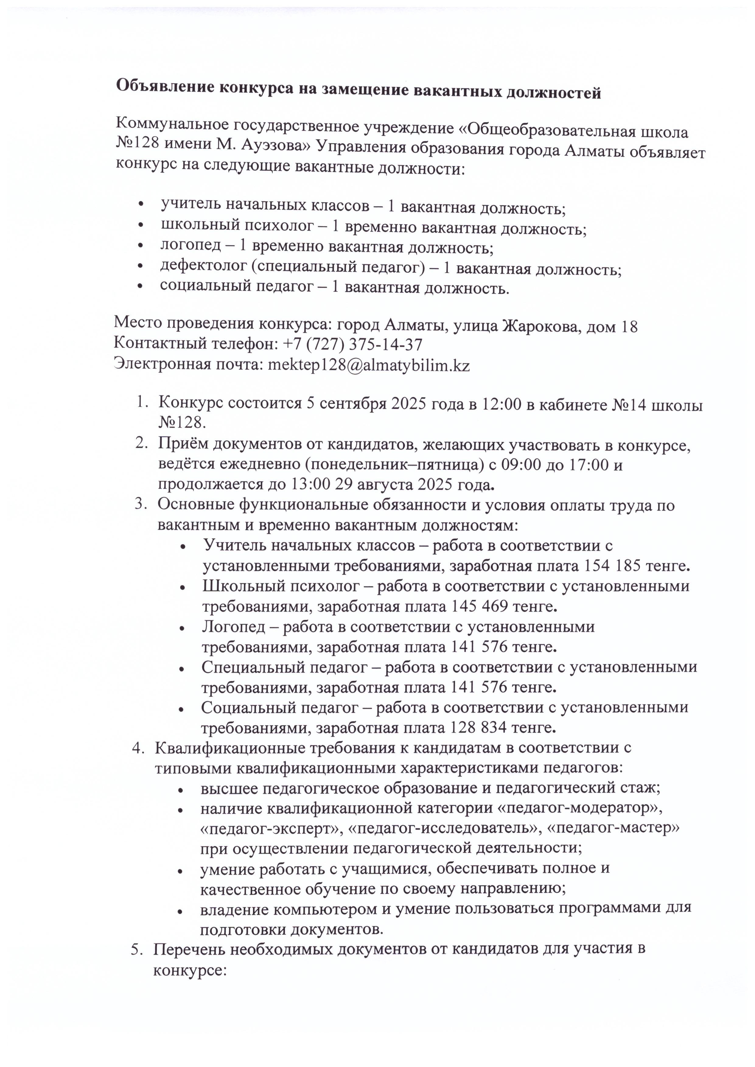 » » Бос лауазымдарға конкурс жариялау