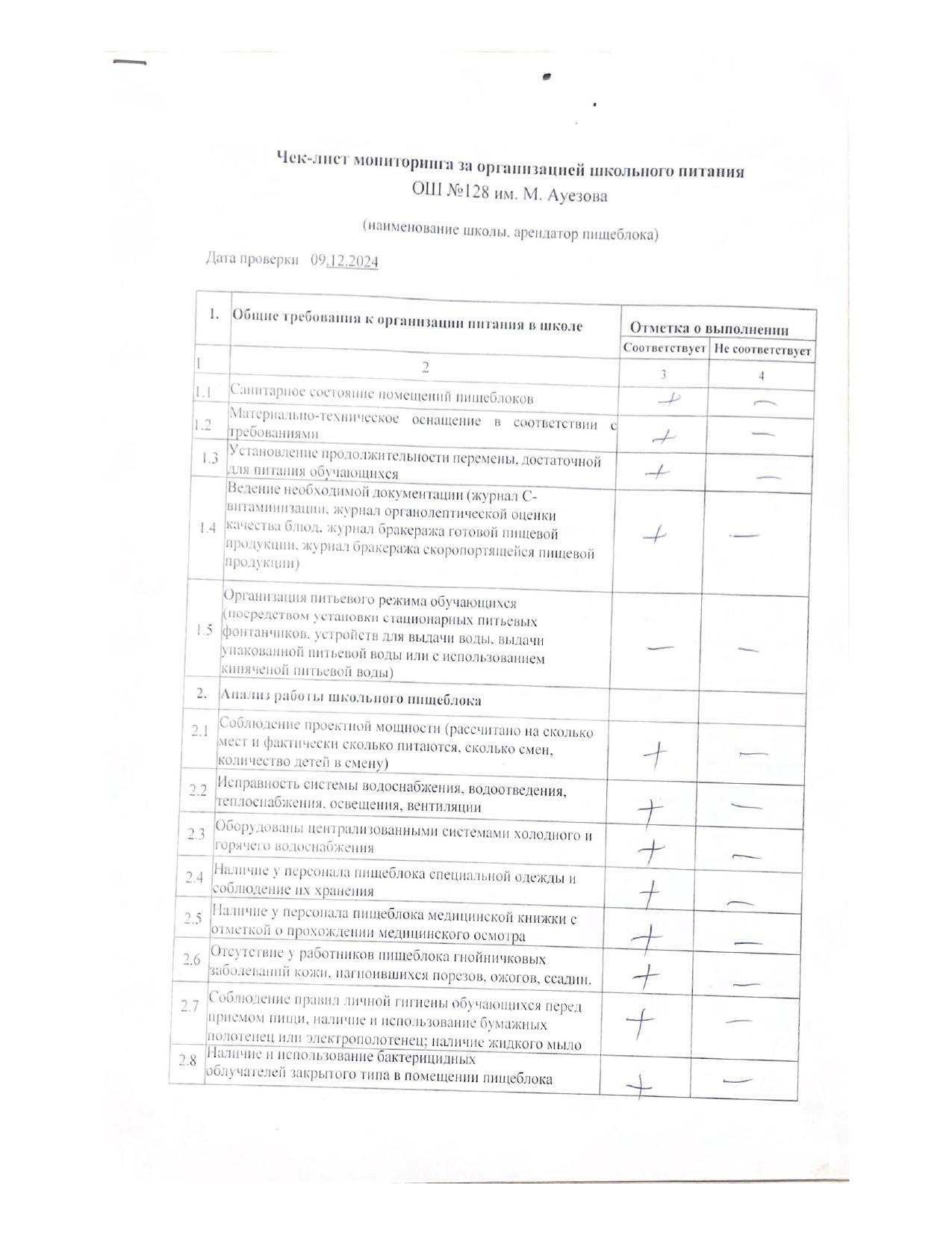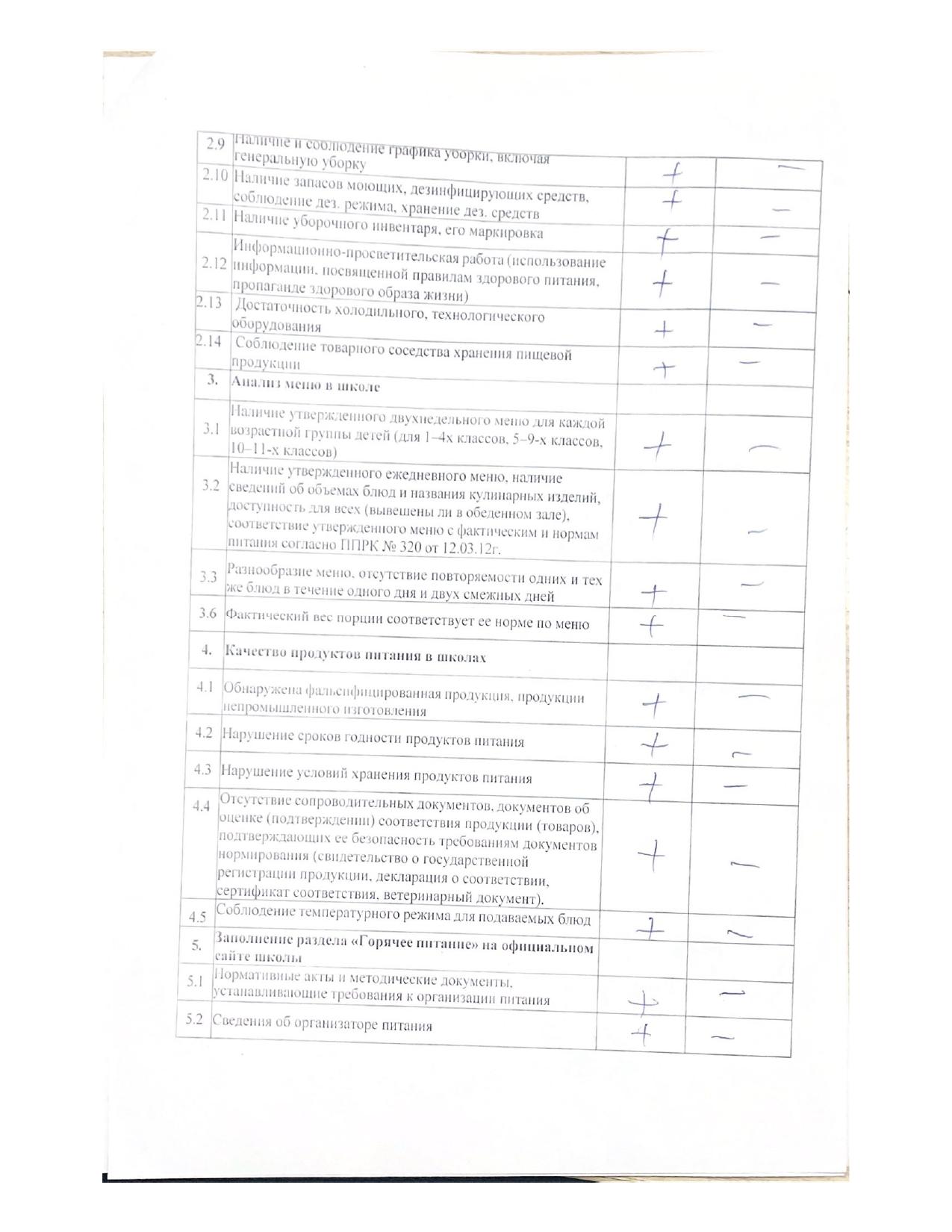 Чек-лист мониторинга за организацией школьного питания