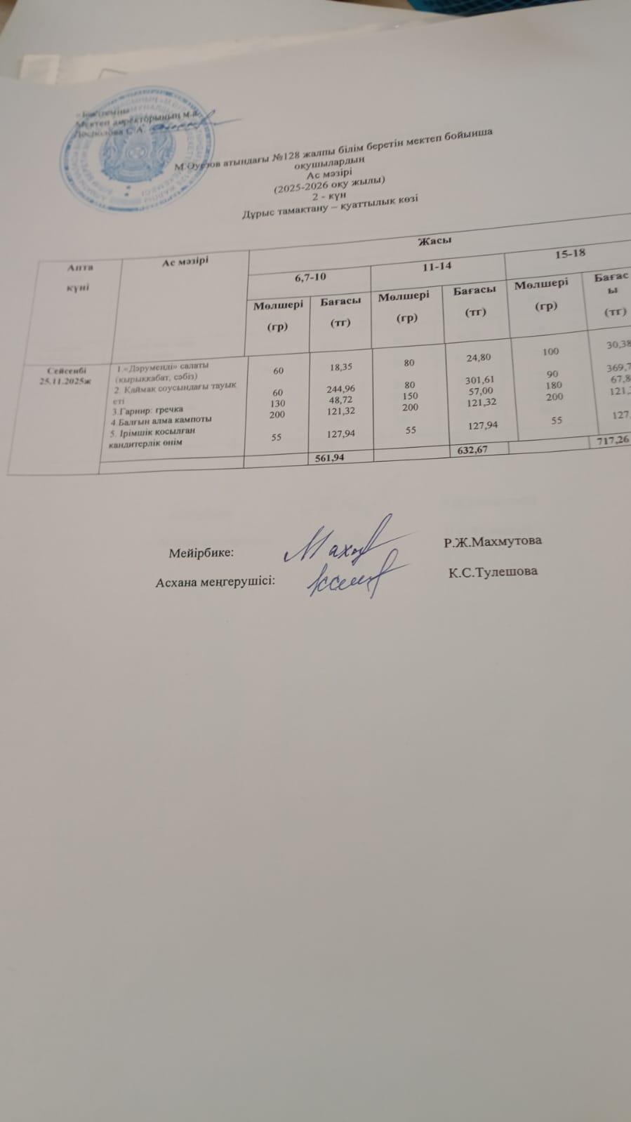 12 ноябрь 2025 Ас мәзірі 2 апта