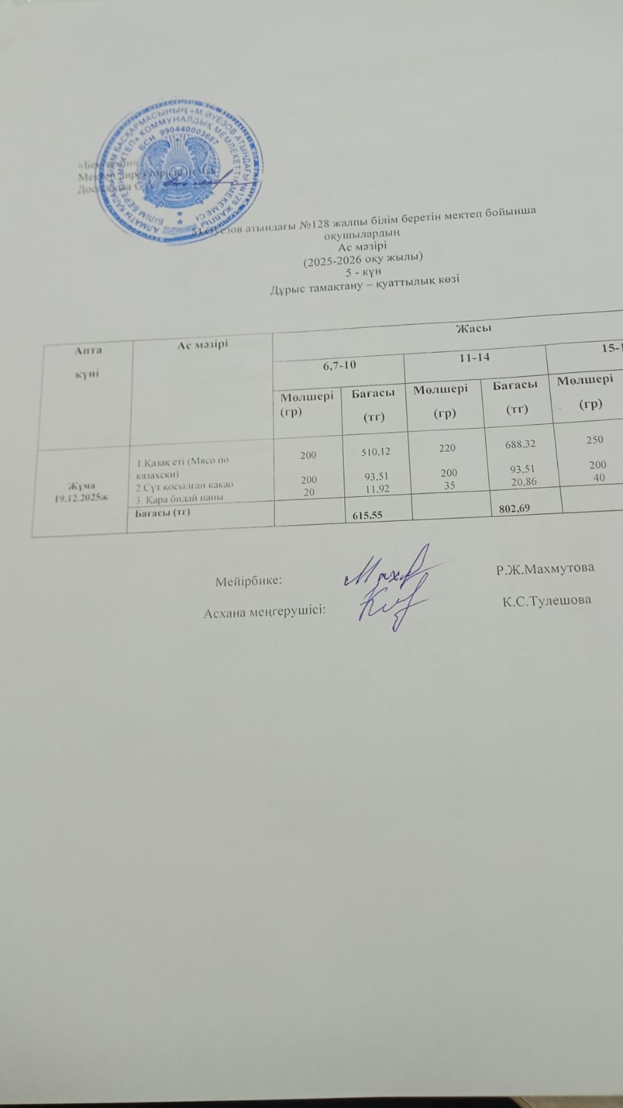14 ноябрь 2025 Ас мәзірі 2 апта