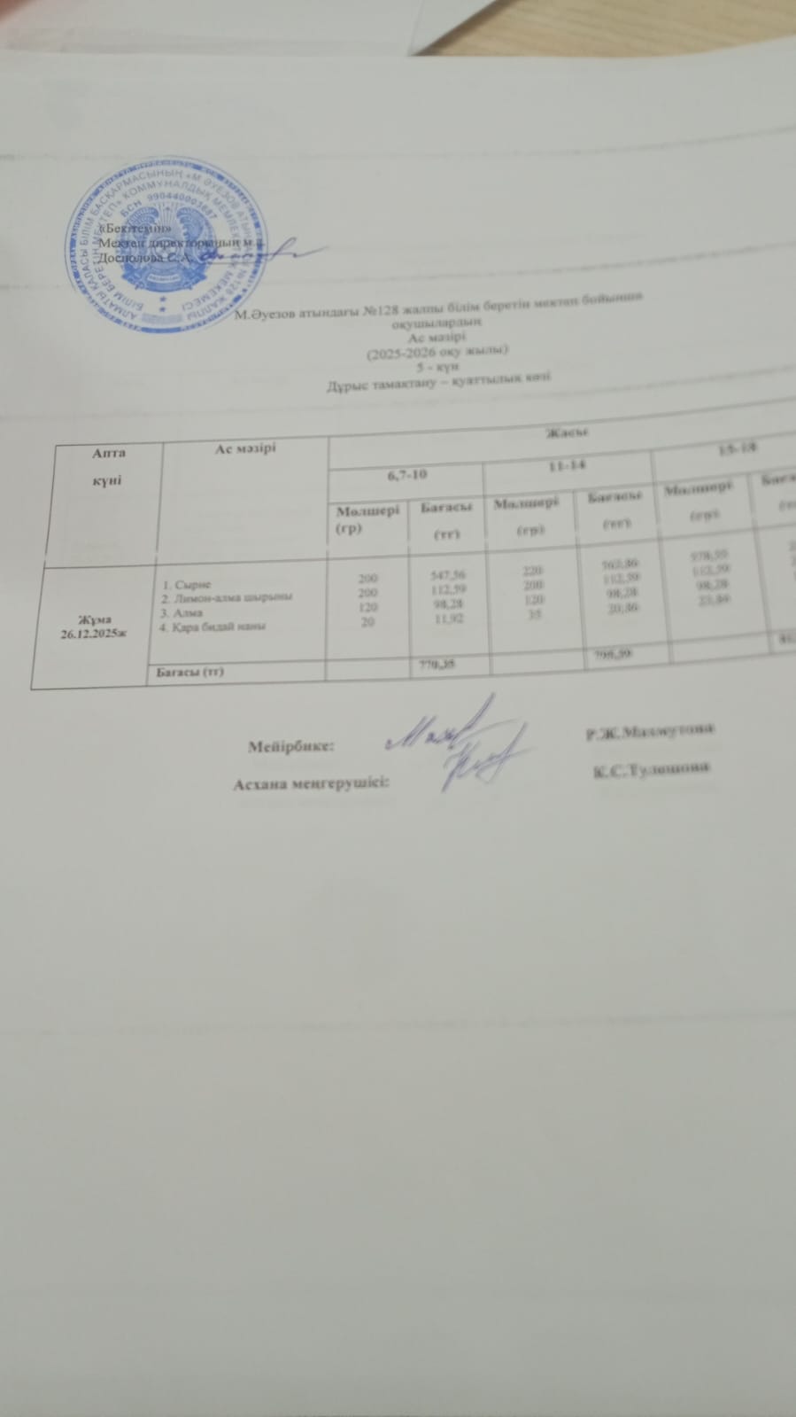 10 ноябрь 2025 Ас мәзірі 2 апта
