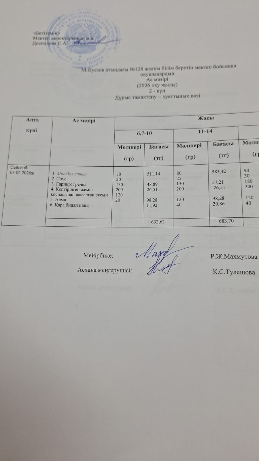 Ас мәзірі 1 апта 03,02,2026