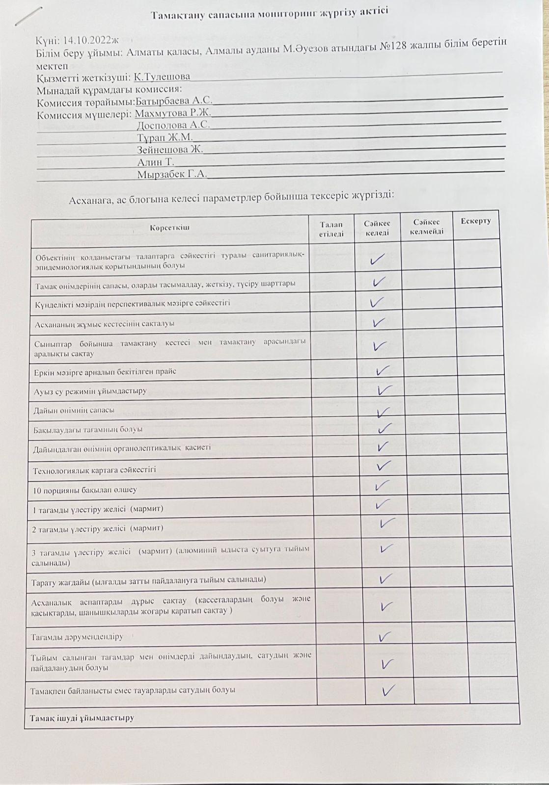 » » » Тамақтану сапасына мониторинг жүргізу актісі 14.10.2022