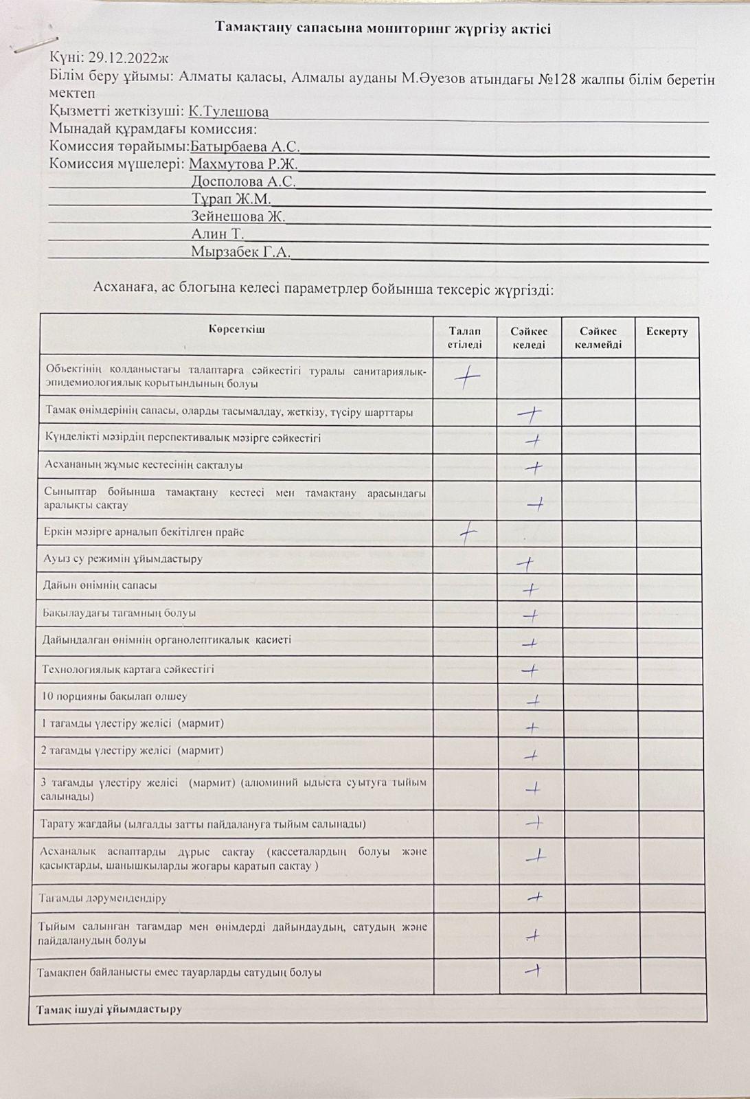 » » » Тамақтану сапасына мониторинг жүргізу актісі 29.12.2022ж