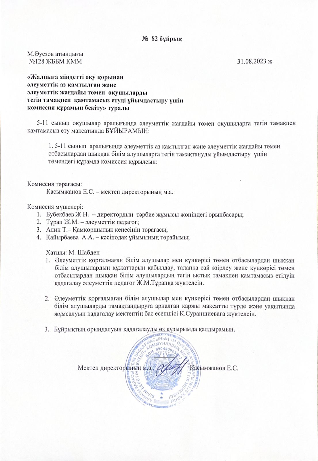 Жалпыға міндетті оқу қорынан әлеуметтік аз қамтылған және әлеуметтік жағдайы төмен,ата-ана қамқорлығынсыз қалған оқшыларды тегін тамақпен қамтамасыз етуді ұйымдастыру 2023-2024 оқу жылы