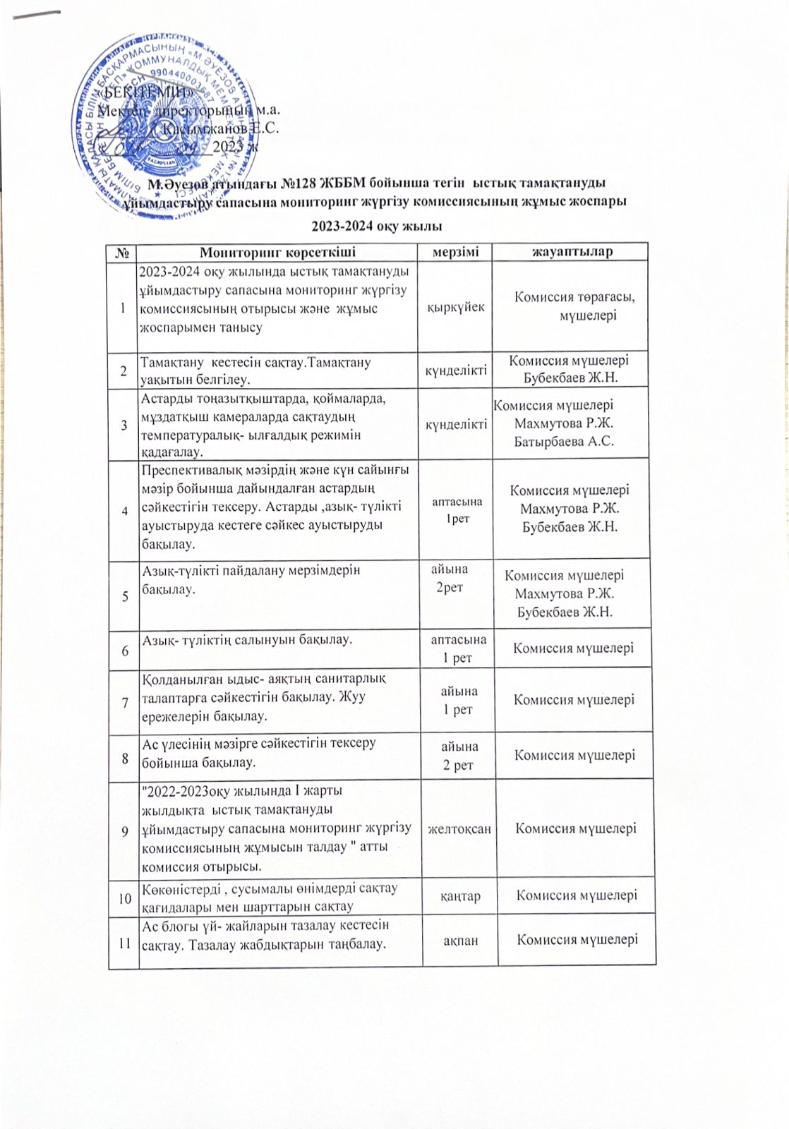 М.Әуезов атындағы №128 ЖББМ бойынша тегін ыстық тамақтануды ұйымдастыру сапасына мониторинг жүргізу комиссиясының жұмыс жоспары 2023-2024 оқу жылы