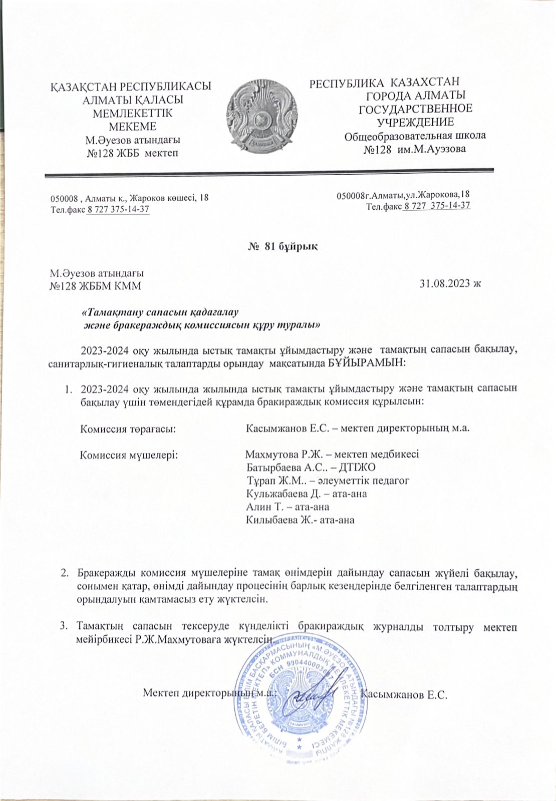 » » » Тамақтану сапасын қадағалау және бракераждық комиссиясын құру туралы 2023-2024 оқу жылы